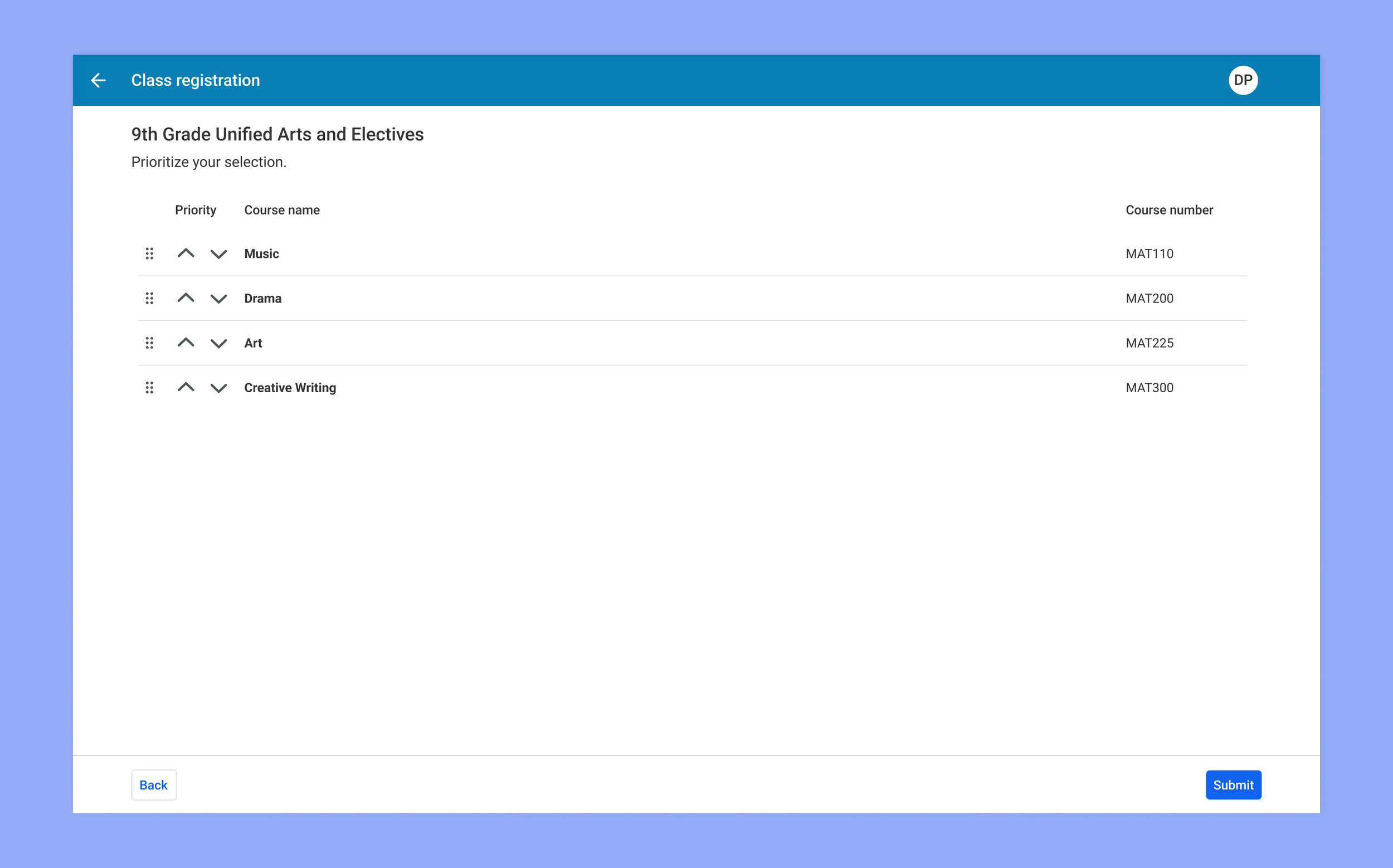 At the same time, I wanted to keep that table-like view available, so the user could easily see the categories they will need to select courses for, and see their selections easily if they’ve made any.