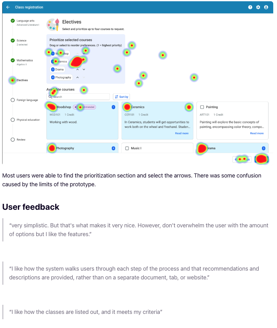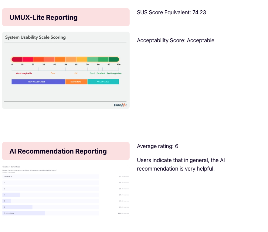 Then the students answered a few questions about the feature’s ease of use and value it provided. The following are our findings, with a 74.23 System usability score, and an average rating of 6 out of 7 for leveraging AI to recommend classes.